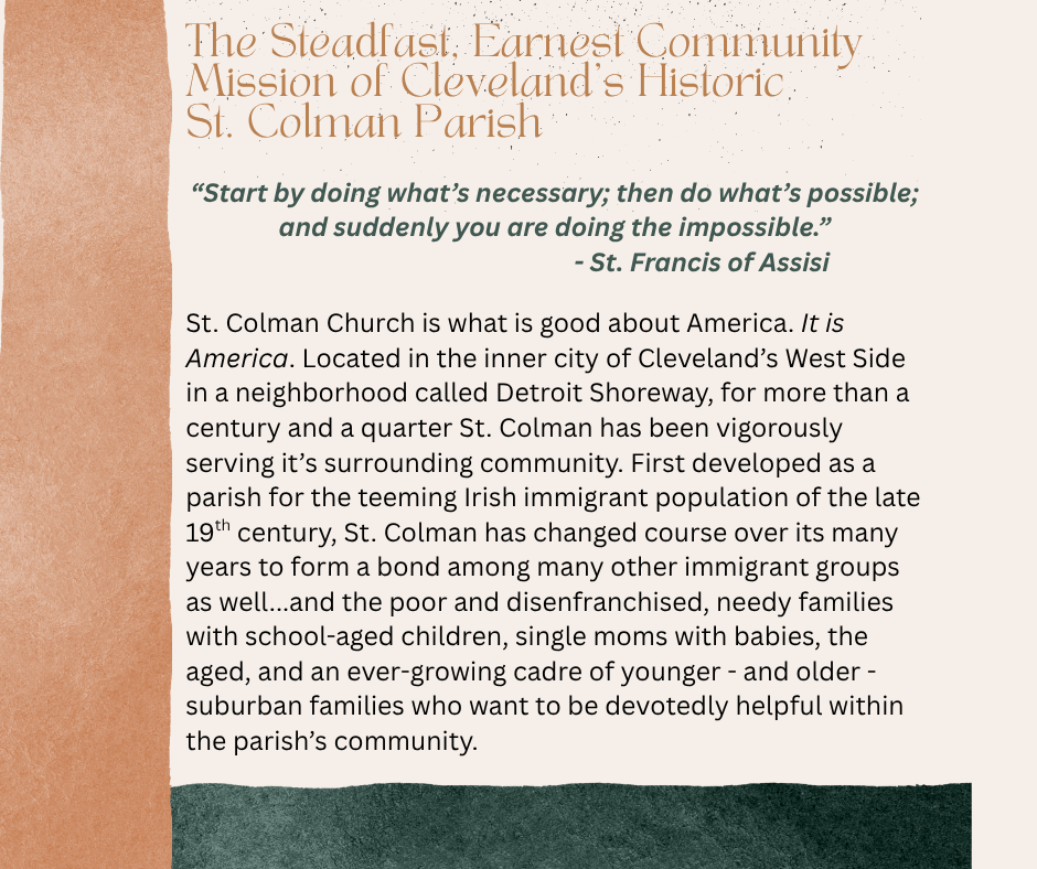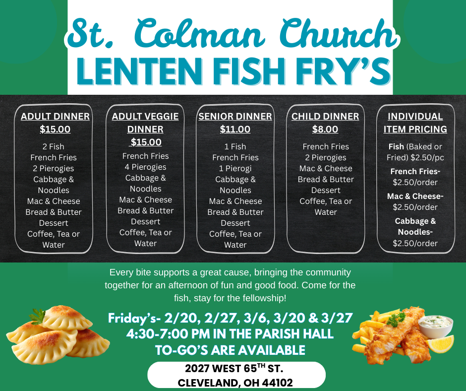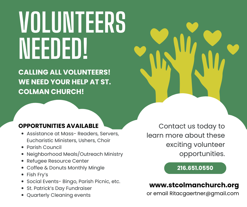 St. Colman Parish is still around today in part to the wonderful volunteers who lead and give of their time and talents. We are looking for some new faces to join our Parish Council and help us continue making St. Colman a vibrant Parish for years to come. We meet once a month and lend a hand where able. There are many ways to get involved! For more information, please reach out to Rita Gaertner at 216.440.1412.
